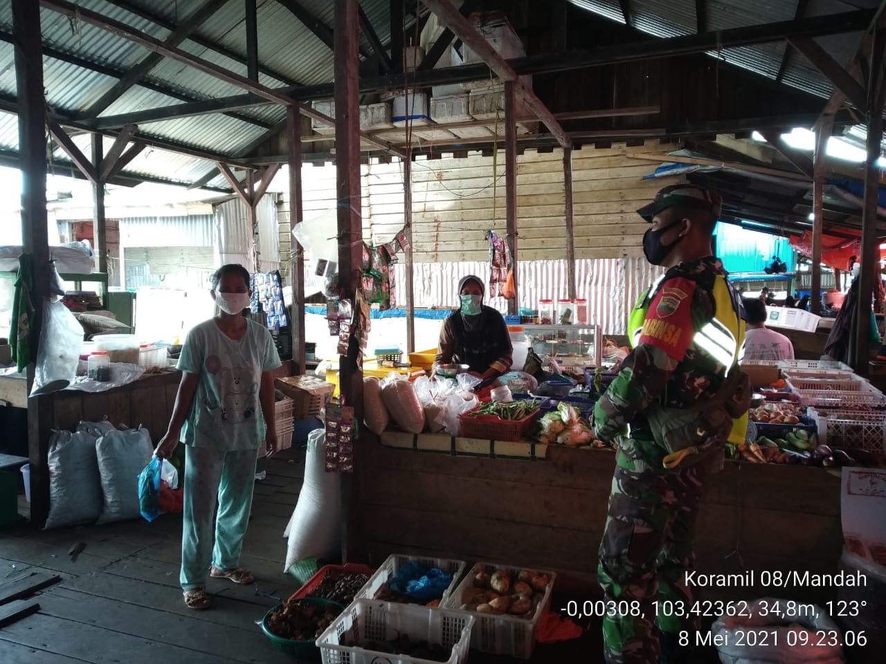SERIBUPARITNEWS.COM,MANDAH - Koramil 08/Mandah Kodim 0314/Inhil melalui Babinsanya Serda Erik A. Sibarani Melaksanakan penegakan disiplin protokol kesehatan kepada pedagang dan pengunjung di pasar Sendawa Desa Bakau Aceh Kecamatan Mandah Sabtu (08/05/2021)