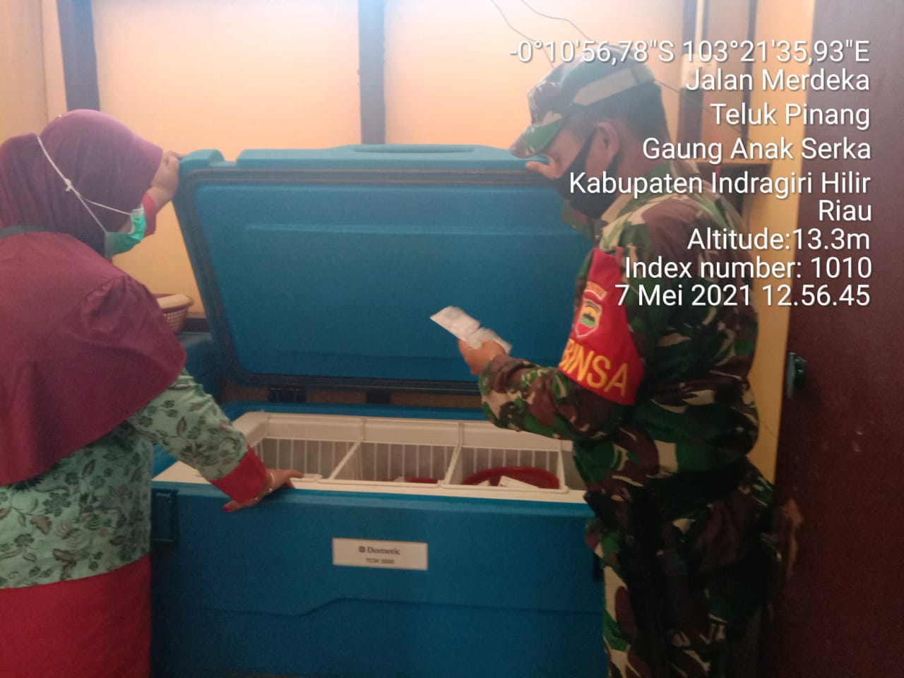 Babinsa Koramil 05/Gas,  Kopda umar mengecek stok vaksin Sinovak bersama tenaga kesehatan di UPT puskesmas di Kelurahan teluk pinang  Kecamatan Gas, Kab Inhil