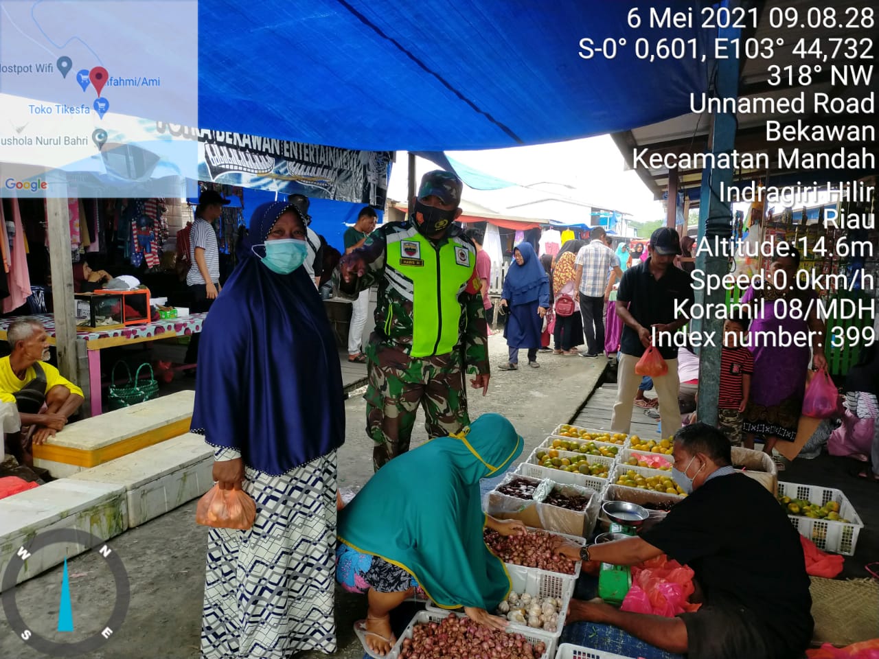 SERIBUPARITNEWS.COM,MANDAH -  Babinsa Koramil 08/Mandah Kodim 0314/Inhil Sertu Haris Mony melaksanakan penegakan protokol disiplin kesehatan Covid kepada para masyarakat dan  pengunjung pasar Kamis (06/05/2021)