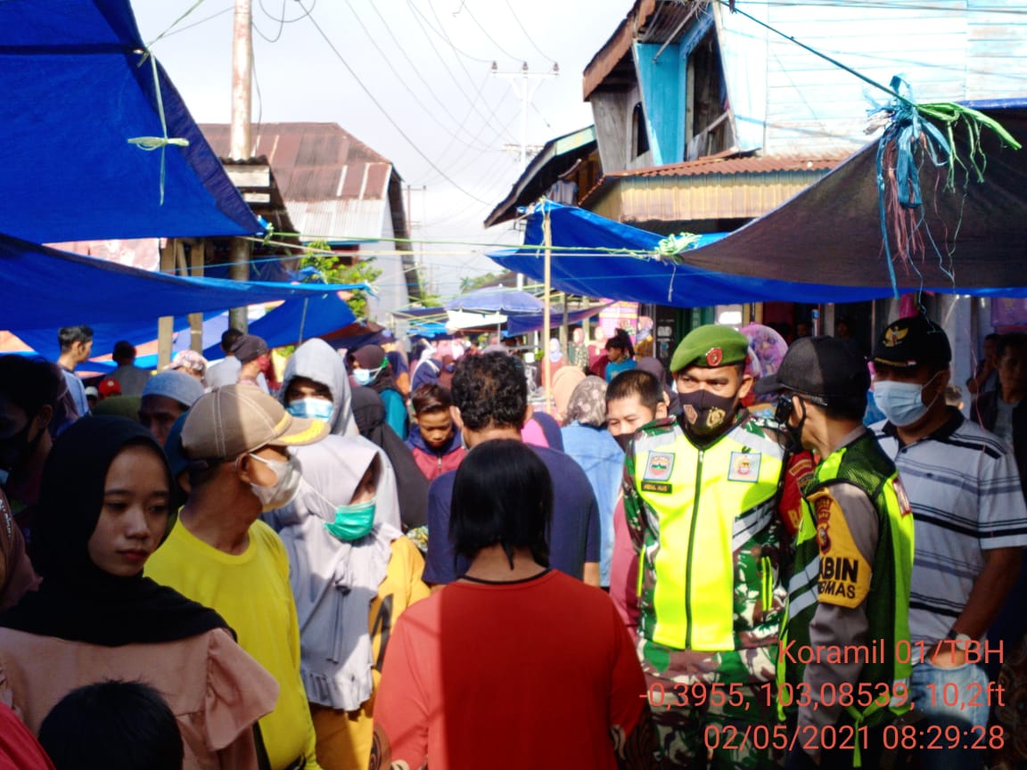SERIBUPARITNEWS.COM, TEMBILAHAN - Di Hari Pasar tepatnya di hari minggu ini, Babinsa Pulau Palas Koramil 01/Tembilahan Kodim 0314/Inhil melaksanakan Penegakan Disiplin Protokol Kesehatan (02/05/2021)