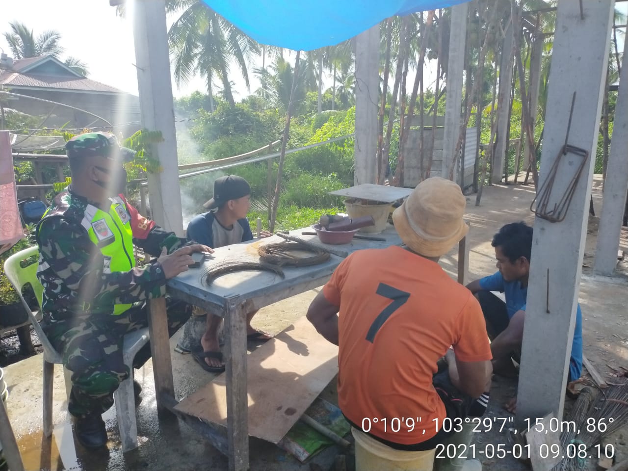 Tampak warganya yang tidak memakai masker di sebuah musholla yang sedang dibangun,Babinsa menemuinya dan berikan nasehat kepada warga tersebut agar patuh memakai masker