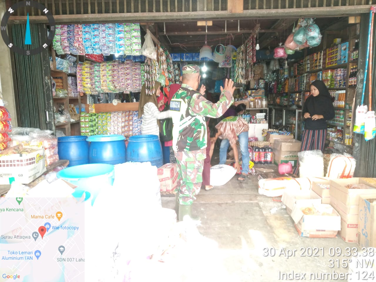 Babinsa menghimbau pedagang dan pembeli agar memakai masker dan menjaga jarak sebagai langkah utama dalam mematuhi protokol kesehatan dimasa pandemik