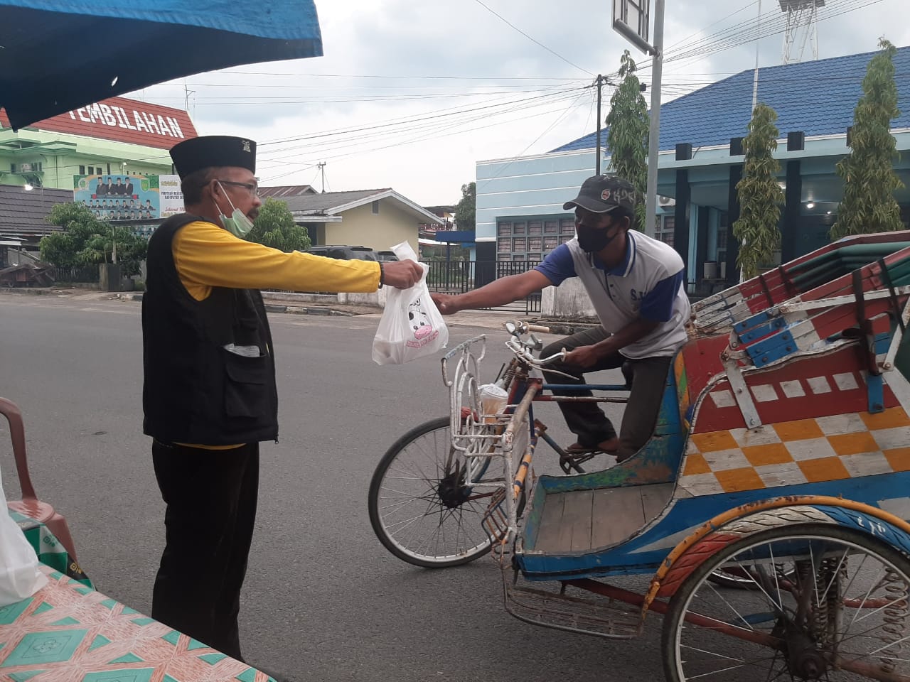 SERIBUPARITNEWS.COM,TEMBILAHAN - Kembali Berbagi, Pembina Yayasan Vioni Bersaudara Marlis Syarif Berikan Takjil dan Pecal Kepada Tukang Becak di Jalan Jenderal Sudirman , Tembilahan, Selasa (27/04/21).