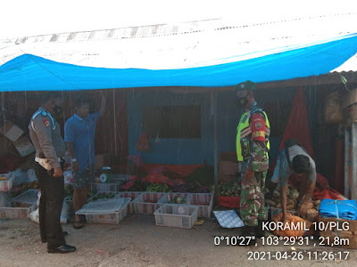 SERIBUPARITNEWS.COM, PELANGIRAN - Guna melaksanakan pembatasan Mobiltas warga dalam penegakkan disiplin, Serma sri wahyono babinsa koramil 10/pelangiran mengecek dan menghimbau para pedagang dan pengunjung menjaga jarak Senin (26/04/2021)