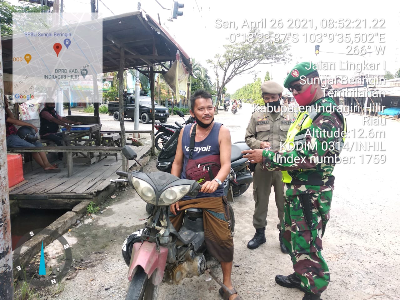 SERIBUPARITNEWS.COM, TEMBILAHAN - Dalam Menghadapi Bulan Puasa Hari ini, Serda Khairunnas Babinsa Koramil 01/Tembilahan Kodim 0314/Inhil mendapat tugas penegakkan disiplin di Simpang Empat Sei Beringin Senin (26/04/2021)