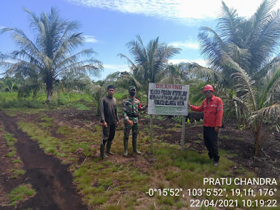 Pratu Candra Winata Babinsa Koramil 05/Gas Kodim 0314/Inhil bersama Manggal Agni Perusahaan Pasang Plang Kayu  Himbauan Dilarang  Membakar lahan