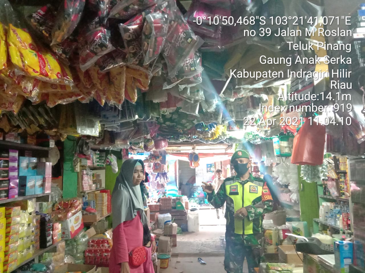 SERIBUPARITNEWS.COM, GAUNG ANAK SERKA - Kopda Umar Nasution Babinsa Koramil 05/Gas Kodim 0314/Inhi melaksanakan Penegakan Disiplin Protokoler Kesehatan Penanganan Covid 19 Terpadu di Sebuah Tokoh Kelontonh pasar Teluk Pinang Kecamatan Gaung Anak Serka Kamis (22/04/2021)