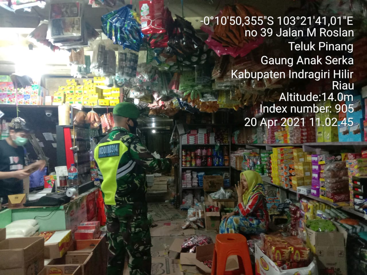SERIBUPARITNEWS.COM, GAUNG ANAK SERKA -   Kopda Umar Nasution Babinsa Koramil 05/Gas Kodim 0314/Inhi  melaksanakan Penegakan Disiplin Protokoler Kesehatan  Penanganan Covid 19 Terpadu di pasar Teluk Pinang  Kecamatan Gaung Anak Serka Selasa (20/04/2021)