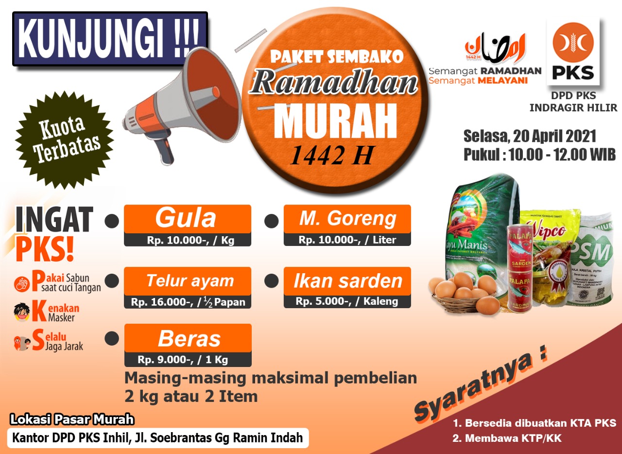 Paket sembako murah ini dilaksanakan pada Selasa 20 April 2021 sejak pukul 10.00 hingga 12.00 Wib di Sekretariat DPD PKS Inhil, Jl. Soebrantas Gg Ramin Indah, tepat di samping wisma 838.