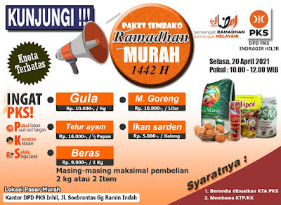 Ditengah melonjaknya harga beberapa kebutuhan pokok dan demi meningkatkan ketersedian sembako bagi masyarakat, khusus di bulan Ramadhan, PKS Inhil akan menjual sejumlah barang komoditas penting tersebut dengan harga murah, yakni sistem paket.