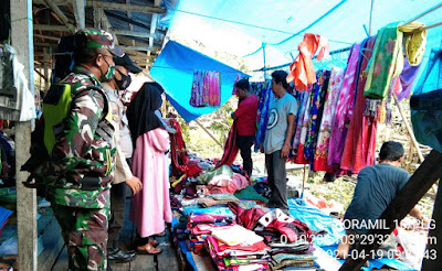Babinsa menghimbau pedagang dan pengunjung memakai.masker dan menjaga jarak aman agar tidak.terjangkit Covid -19
