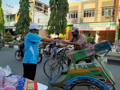 Setelah memborong jualan milik pedangang, kue dan air di kemas dalam bentuk takjil lalu dibagi bagikan secara gratis kepada penarik becak yang melintas di lokasi tersebut.