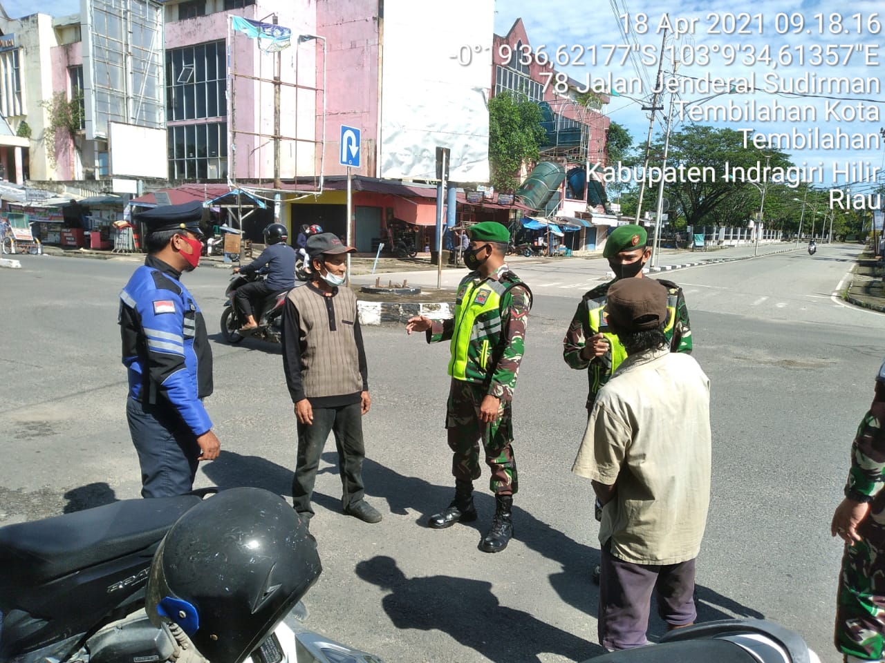 SERIBUPARITNEWS.COM, TEMBILAHAN - Kopda Komarudin   Babinsa Koramil 01/Tembilahan Kodim 0314/Inhil Melaksanakan Penegakkan Disiplin di Jalan Sudirman  Minggu   (18/04/2021)
