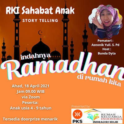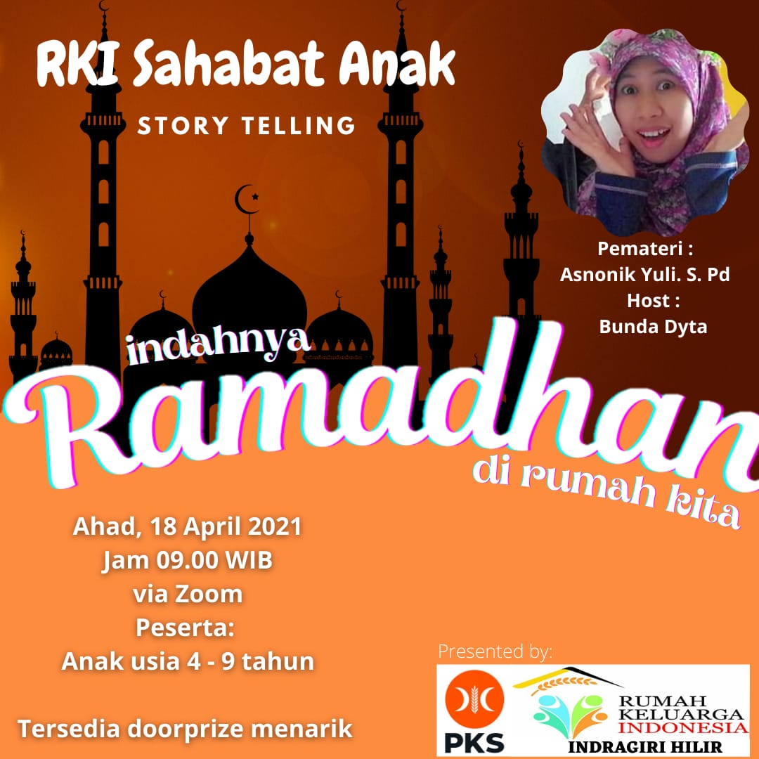 SERIBUPARITNEWS.COM,Tembilahanan -- Peduli dengan tumbuh kembang anak, termasuk dibulan suci Ramadhan, maka Rumah Keluarga Indonesia bersama Bidang Perempuan dan Ketahanan Keluarga PKS Inhil menggelar even storytelling. Menghadirkan Narasumber Bunda Asnonik Yuli S.Pd l, serta dipandu Host Bunda Dyta kegiatan ini akan diselenggarakan