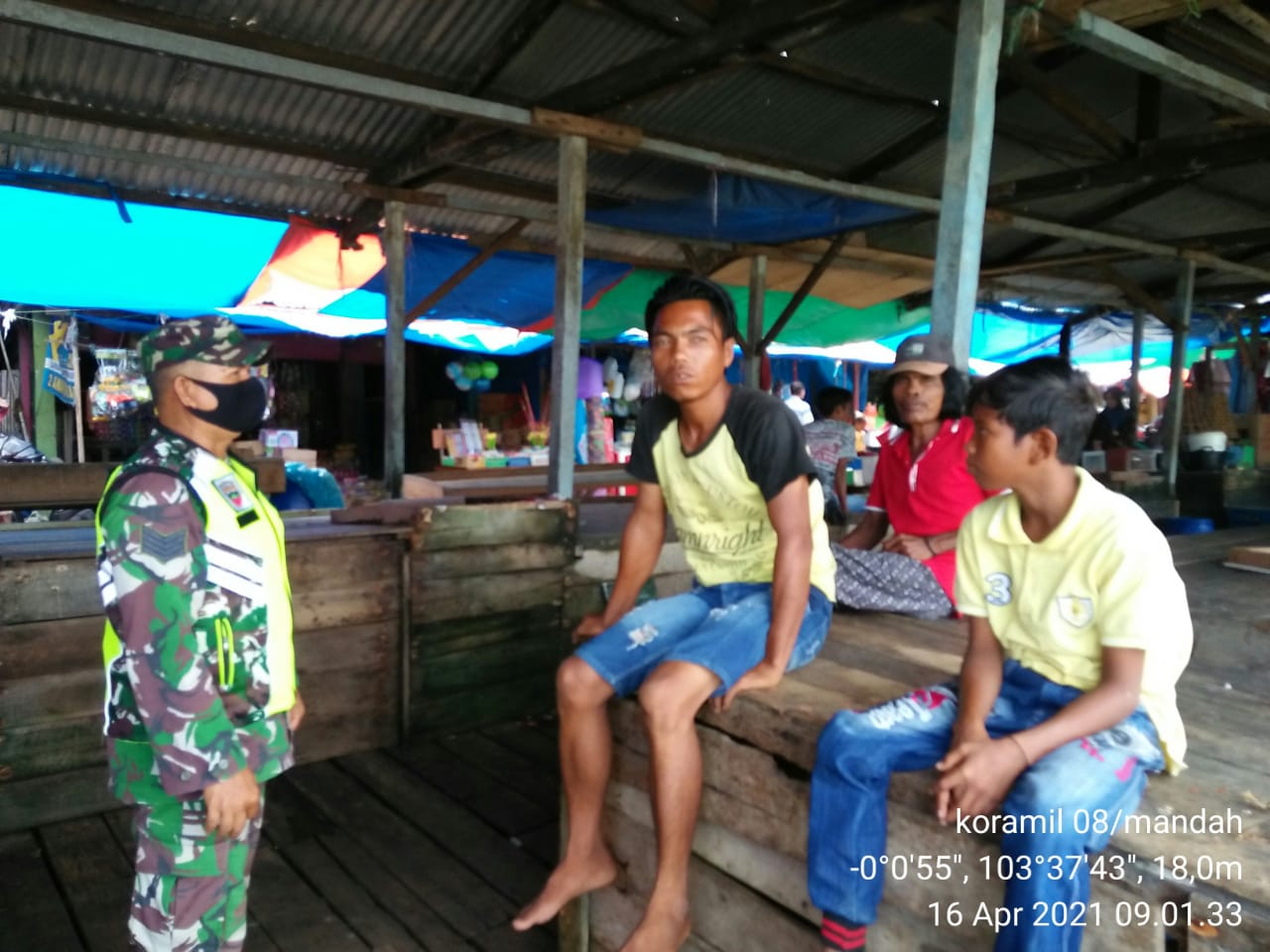 SERIBUPARITNEWS.COM, MANDAH - Serma M. Darmansyah Melaksanakan Penegakan disiplin protokol kesehatan Covid  kepada warga agar tetap mematuhi anjuran aturan pemerintah yang dilaksanakan di Kantin Pasar Desa Belaras Kecamatan Mandah Jumat (16/04/2021)