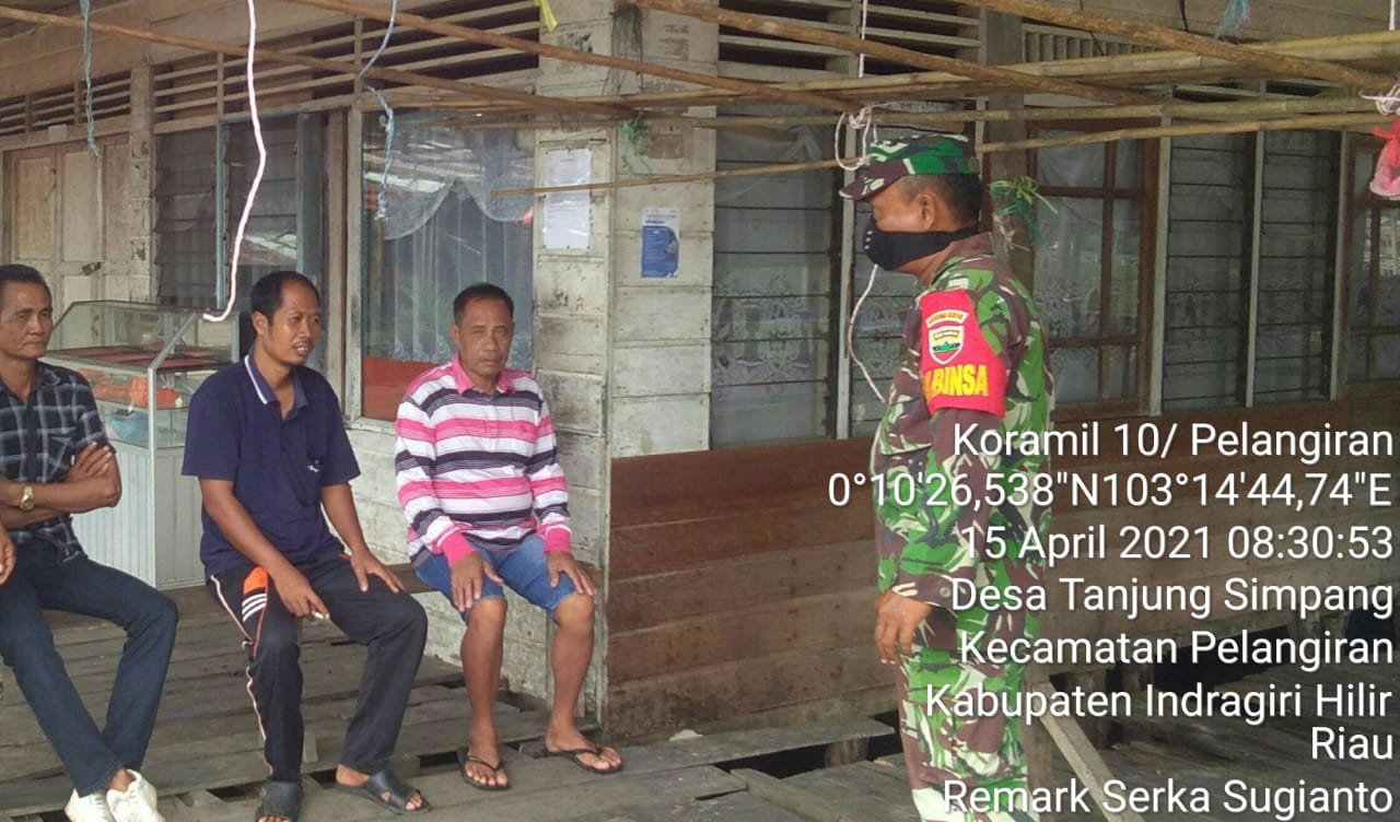 SERIBUPARITNEWS.COM, PELANGIRAN - Setelah melaksanakan anjangsana, Babinsa Koramil 10/Pelangiran Kodim 0314/Inhil Serka Sugianto melaksanakan kegiatan sosialisasi penegakkan disiplin protokol kesehatan di pasar lama di desa tanjung simpang Kecamatan Pelangiran ,Kab.Inhil Kamis (15/04/2021)