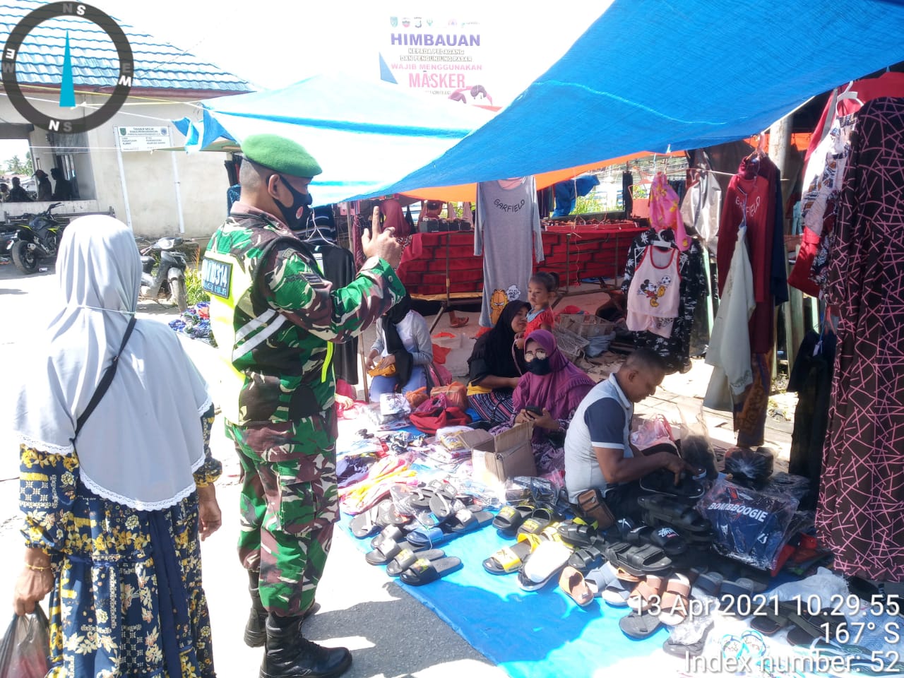 SERIBUPARITNEWS.COM, GAUNG - Babinsa  Koramil 05/Gaung Anak Serka Kodim 0314/InhilSerka Tota Simbolon  melaksanakan penegakan disiplin protokol kesehatan kepada pedagang agar menggunakan masker dan menjaga jarak di Kelurahan kuala lahang  Kecamatan Gaung, Kab Inhil Selasa (13/04/2021)