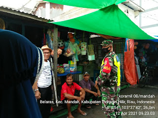 SERIBUPARITNEWS.COM, MANDAH - Babinsa Koramil 08/Mnadah Kodim 0314/Inhil Serma M. Darmansyah Melaksanakan Penegakkan disiplin kepada Pedagang dan Pengunjung Pasar di Desa Belaras Kecamatan Mandah Kab. Inhil Senin (12/04/2021)