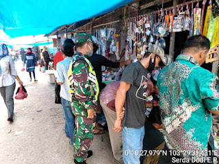 Serda Dodi Eka Putra Babinsa Koramil 10/Pelangiran Cek Penerapan Protokol Kesehatan Kepada Pedagang Pasar dalam mematuhi protokol kesehatan seperti memakai masker,menjaga jarak dan mencuci tangan