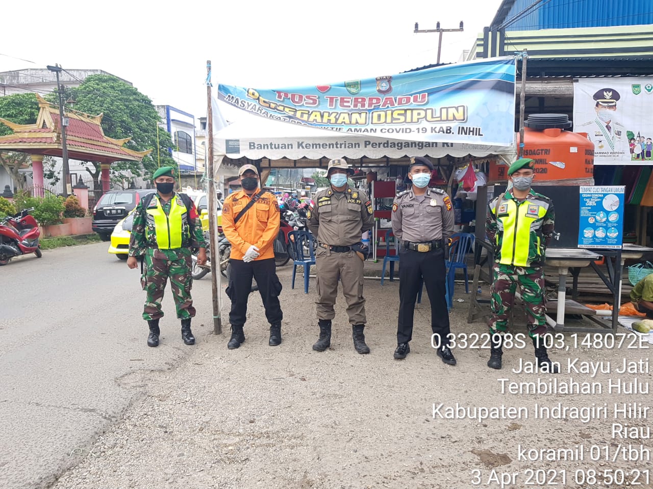 SERIBUPARITNEWS.COM,TEMBILAHANHULU - Serda Adri Candra Babinsa Koramil 01/Tembilahan Kodim 0314/Inhl menegakan disiplin terpadu protokol kesehatan di Pos Pasar Kayu Jati Kecamatan Tembilahan Hulu Kabupaten Indragiri Hilir Sabtu (03/04/20201)