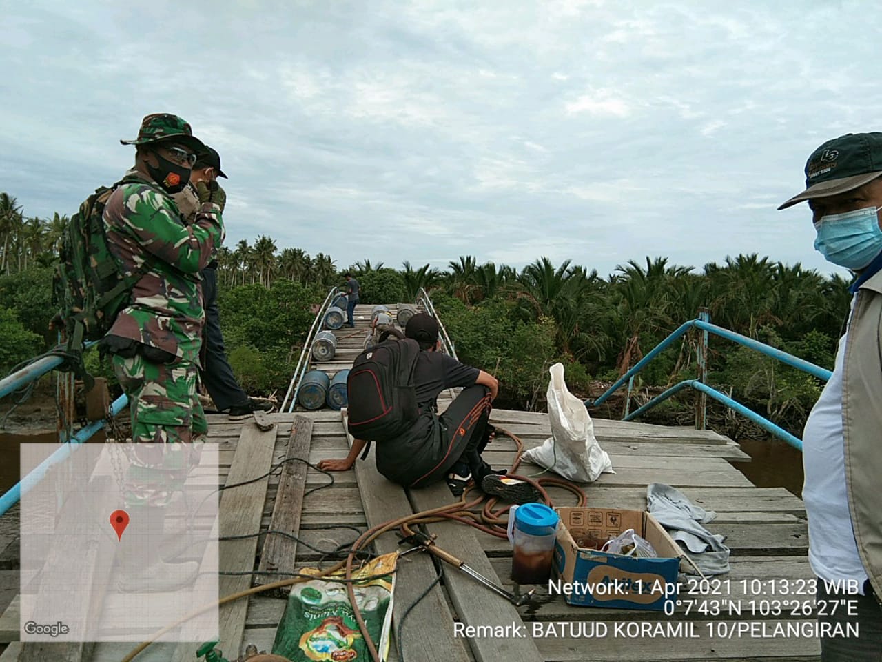 SERIBUPARITNEWS.COM,PELANGIRAN - Serma Sri Wahyono mendampingi pelaksanaan kegiatan pengawasan terhadap jembatan penyeberangan yang akan dirubuhkan bersama Kadis PU Inhil dan Kabid serta Kades Desa Terusan beringin jaya dan staf desa kelurahan pelangiran Kamis (01/04/2021)