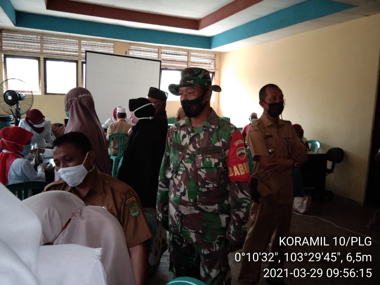 Serma Sri Wahyono Babinsa Koramil 10/Pelangiran Kodim 0314/Inhil melaksanakan kegiatan pengawasan penyuntikan vaksin sinovac kepada ASN,Calon Jemaah Haji dan Tokoh Masyarakat di Aula kantor Camat Pelangiran Kelurahan Pelangiran Senin (29/03/2021)