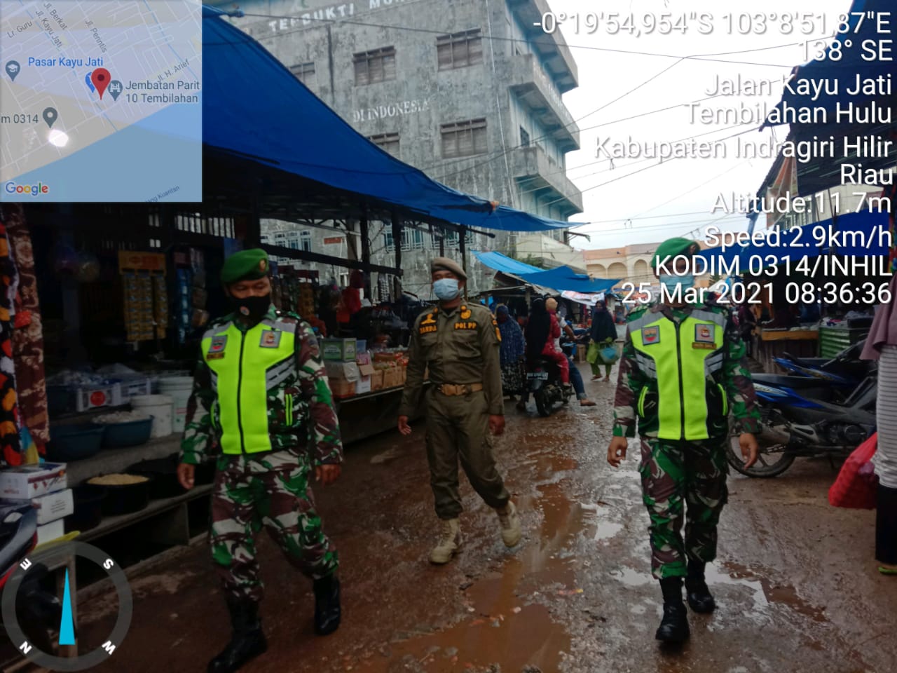 SERIBUPARITNEWS.COM, TEMBILAHAN - Sertu M.Yasin Babinsa Koramil 01/Tembilahan Kodim 0314/Inhl menegakan disiplin terpadu protokol kesehatan di Pos Pasar Kayu Jati Kecamatan Tembilahan Hulu Kabupaten Indragiri Hilir Jumat (25/03/2021)