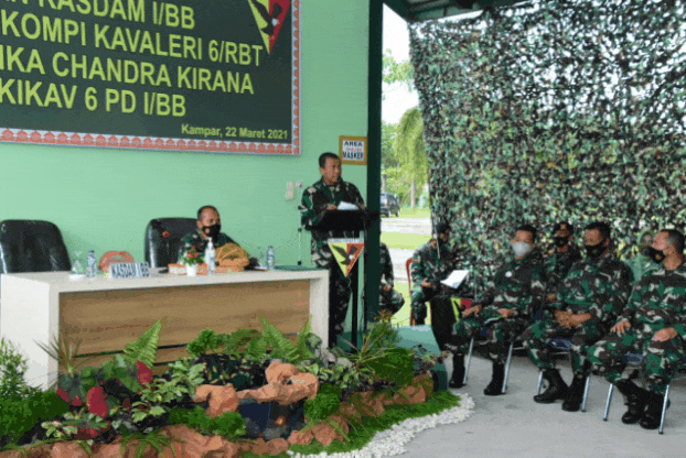 "Pada kesempatan kunjungan ke Wilayah Korem 031/WB ini saya sempatkan untuk mengunjungi Satuan-Satuan Kodam yang berada di wilayah Korem 031/WB diantaranya Kompi Kavaleri 6/RBT. Saya berharap para prajurit mempunyai rasa bangga dengan Satuan ini, begitu juga saya ucapkan Terima kasih kepada ibu-ibu persit yang telah mendampingi suami dalam melaksanakan Tugas serta mendidik dan menjaga putra-Putrinya". Ucap Kasdam I/BB saat memberikan Pengarahan kepada Prajurit Kikav 6/RBT.