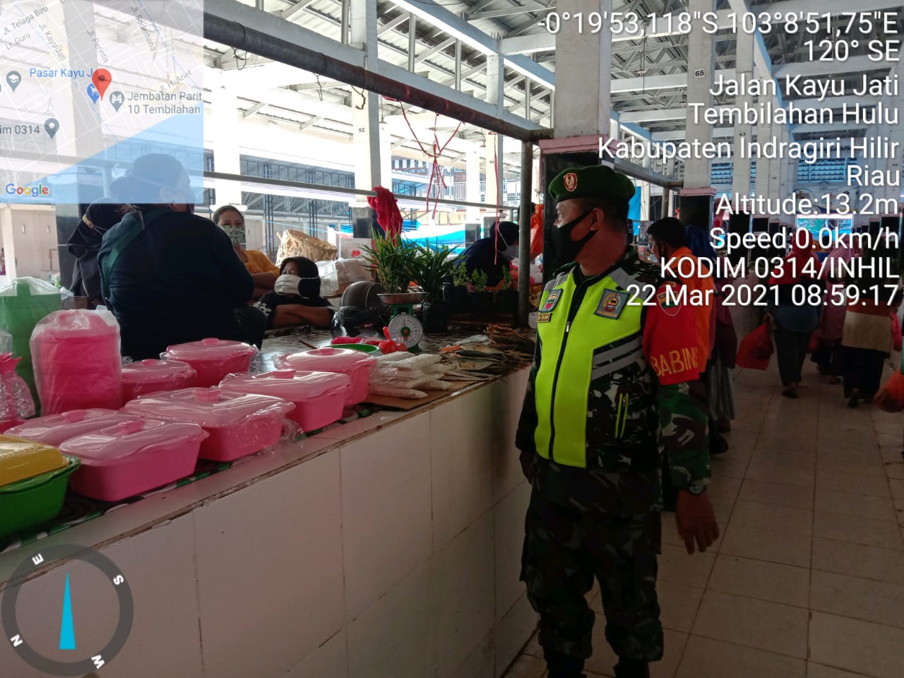 Sertu M.Yasin Babinsa Koramil 01/Tembilahan Kodim 0314/Inhil Cek Penerapan Protokol Kesehatan di Pasar kayu Jati