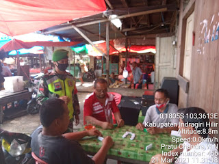 SERIBUPARITNEWS.COM, GAUNG ANAK SERKA - Kopda Umar Nasution Babinsa Koramil 05/Gaung Anak Serka penegakkan disiplin di Pasar Kelurahan Teluk Pinang Kecamatan Gaung Anak Serka Minggu (21/03/2021)