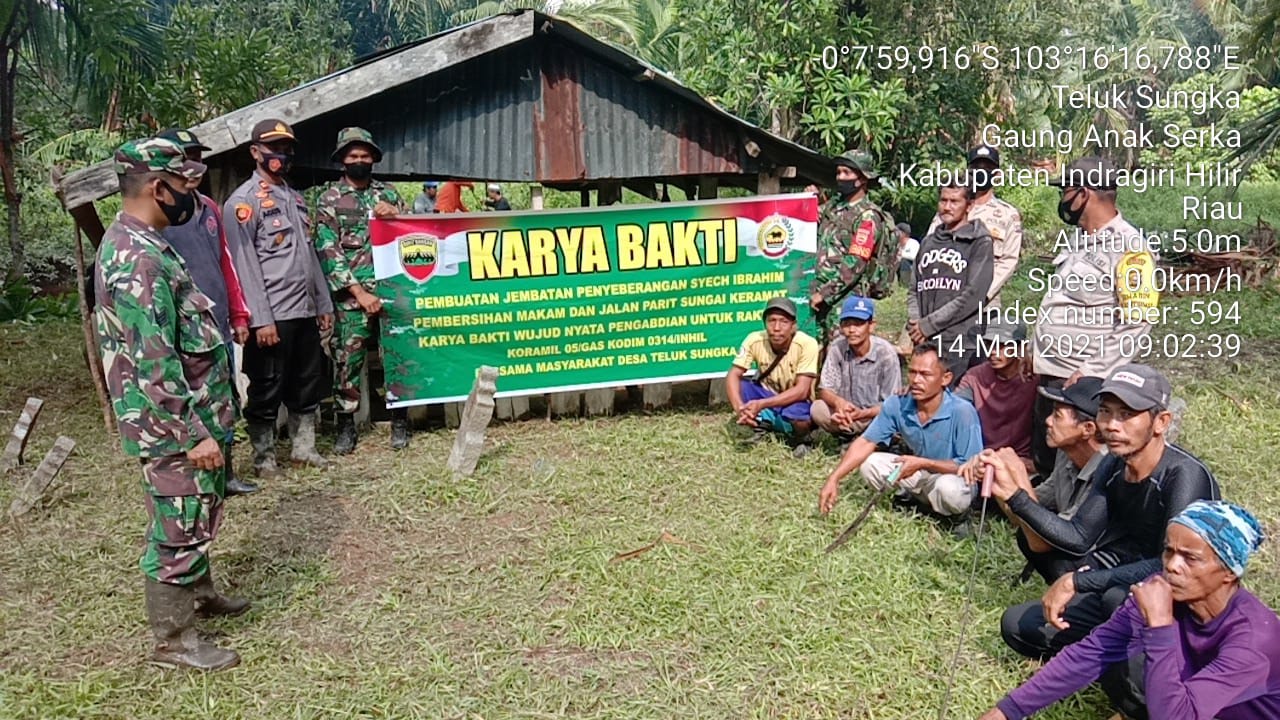 SERIBUPARITNEWS.COM, GAUNG ANAK SERKA - Babinsa Koramil 05/Gaung Anak Serka Kodim 0314/Inhil Serka Nawawi, Kopda Umar Nasution dan Kaplosek Gas dan Personilnya Melaksanakan Karya Bhakti di Makam Syekh Ibrahim Desa Teluk Sungka Kecamatan Gaung Anak Serka Minggu (14/03/2021)