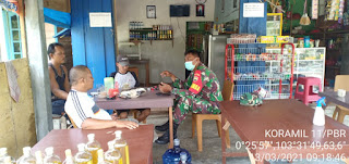 SERIBUPARITNEWS.COM, PULAUBURUNG - Babinsa Koramil 11/Pulau Burung  Serda Arif D Melaksanakan Komsos dengan warga tentang masih diberlakukan disiplin protokol kesehatan di Desa Pulau Burung Kecamatan Pulau Burung Sabtu (13/03/2021)