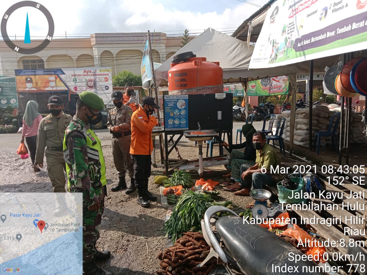 SERIBUPARITNEWS.COM, TEMBILAHAN - Serda Zulfahri Babinsa Koramil 01/Tembilahan Kodim 0314/Inhil menegakan disiplin terpadu protokol kesehatan di Pos Pasar Kayu Jati Kecamatan Tembilahan Hulu Kabupaten Indragiri Hilir Sabtu (06/03/2021)