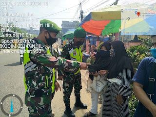 SERIBUPARITNEWS.COM, TEMBILAHAN - Serda  Zulfahri Babinsa Koramil 01/Tembilahan Kodim 0314/Inhl menegakan disiplin terpadu protokol kesehatan di Pos  Pasar Kayu Jati Kecamatan Tembilahan Hulu Kabupaten Indragiri Hilir Sabtu  (28/02/2021)