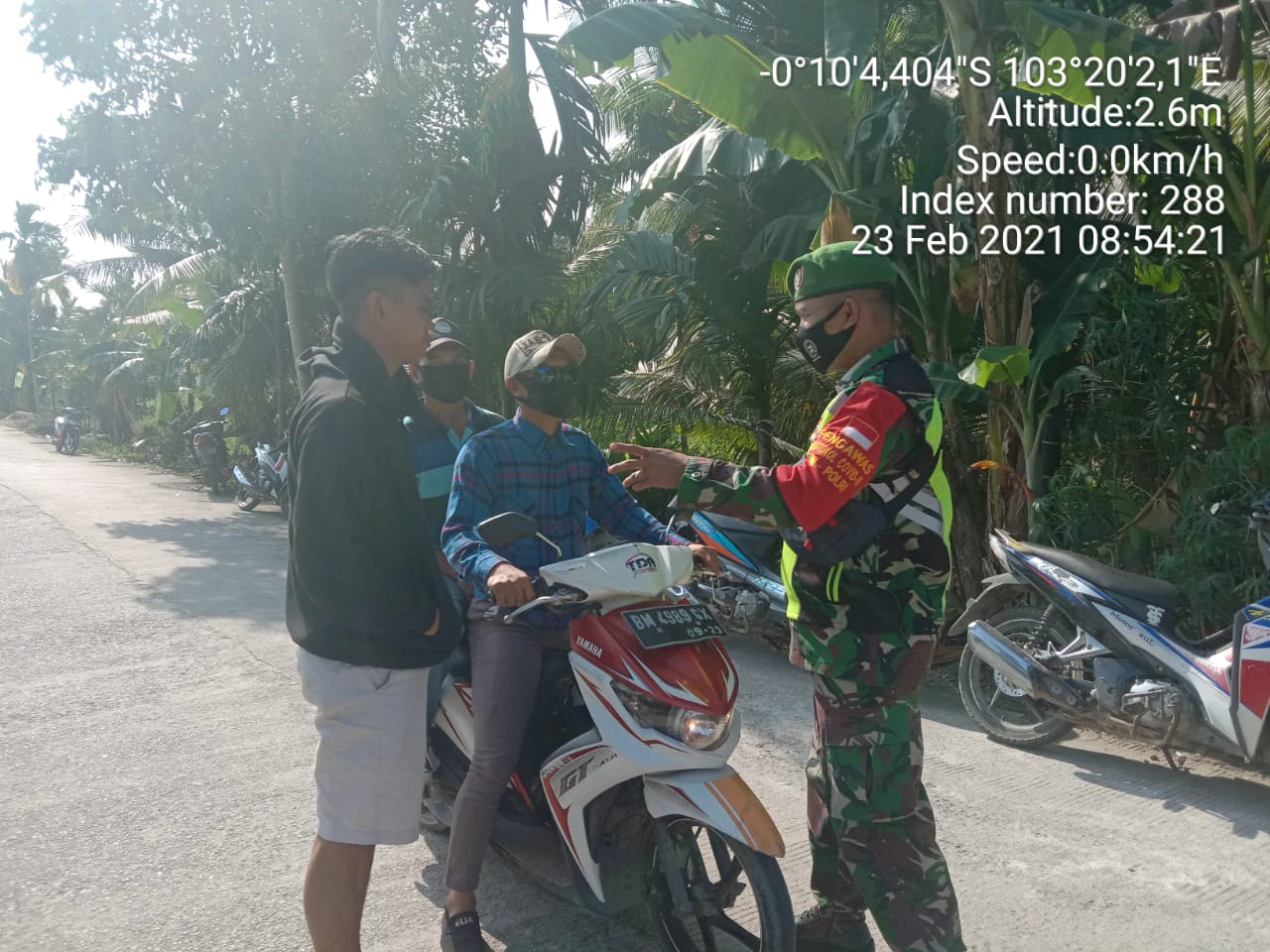 SERIBUPARITNEWS.COM, GAUNG ANAK SERKA -   Kopda Umar Nasution Babinsa Koramil 05/Gas Kodim 0314/Inhi telah melaksanakan Penegakan Disiplin Protokoler Kesehatan  Penanganan Covid 19 Terpadu  di Jalan Lintas Teluk pinang Kecamatan Gaung Anak Serka Selasa  (23/02/2021)