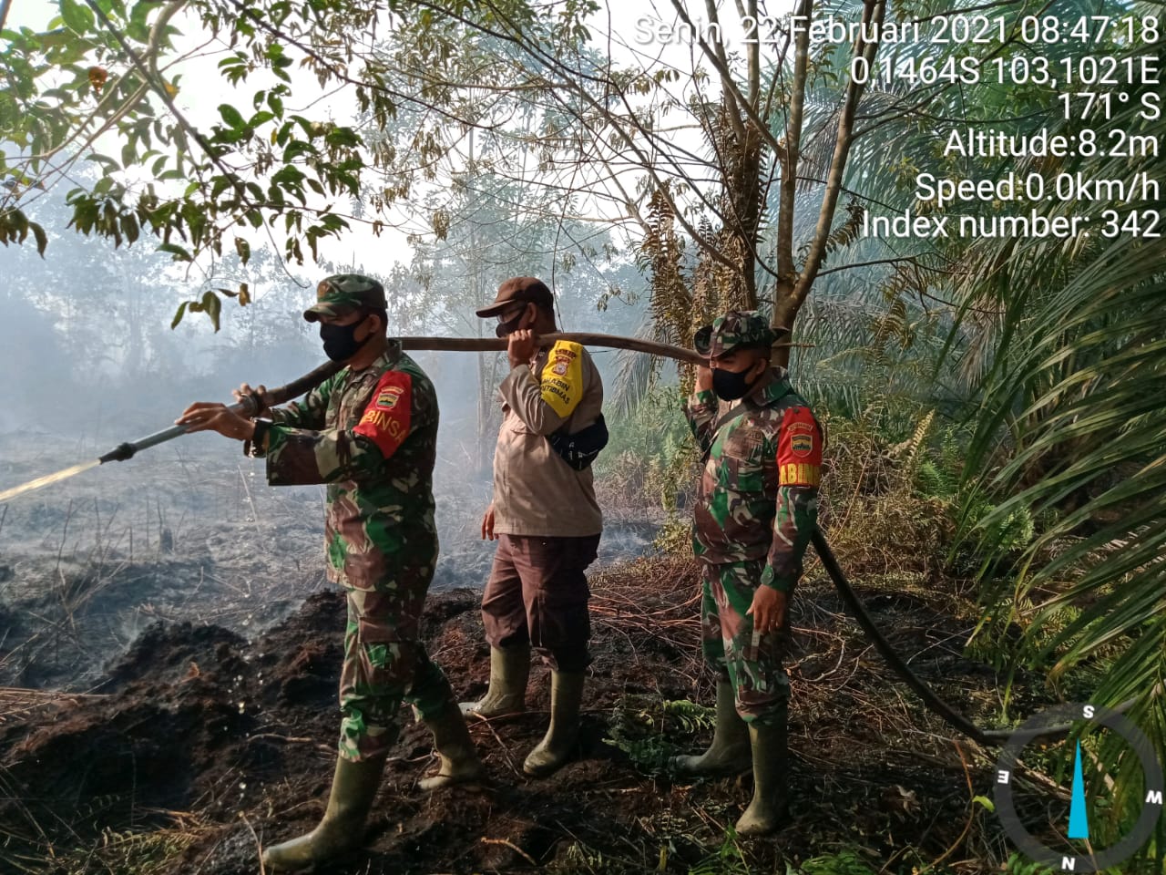 SERIBUPARITNEWS.COM, GAUNG ANAK SERKA - Babinsa  Koramil 05/Gas Kodim 0314/Inhil  Dipimpin Kopda Hutrizahroni bersama angg polsek dan  BPBD Melaksanakan pemadaman dan pendinginan karhutla hari  Kedua di Desa Rambayan Kecamatan Gaung Anak Serka Senin (22/02/2021)