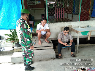 Tampak warganya yang tidak memakai masker di sebuah kedai kopi,Babinsa menemuinya dan berikan nasehat kepada warga tersebut agar patuh memakai masker