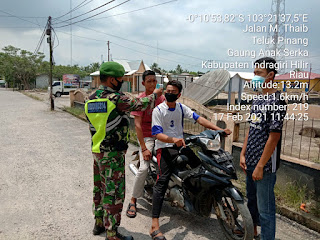 SERIBUPARITNEWS.COM, GAUNG ANAK SERKA - Babinsa koramil 05/Gas Kodim 0314/Inhil  kopda Umar Melaksanakan Penegakkan disiplimn Kepada pejalan kaki dan pengguna kendaraan roda dua di Kelurahan Teluk Pinang Kecamatan Gaung Anak Serka Rabu (17/02/2021)