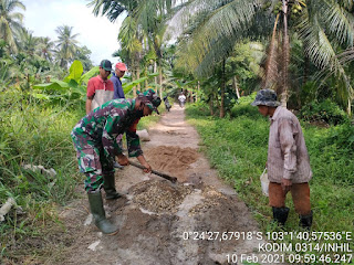 SERIBUPARITNEWS.COM, TEMBILAHANHULU - Sertu Masri Babinsa Koramil 01/Tembilahan Kodim 0314/Inhil Melaksanakan Gotong Royong Semenisasi jalan Sungai Cambai Dusun Gemilang Desa Sialang Panjang Kamis (11/02/2021)