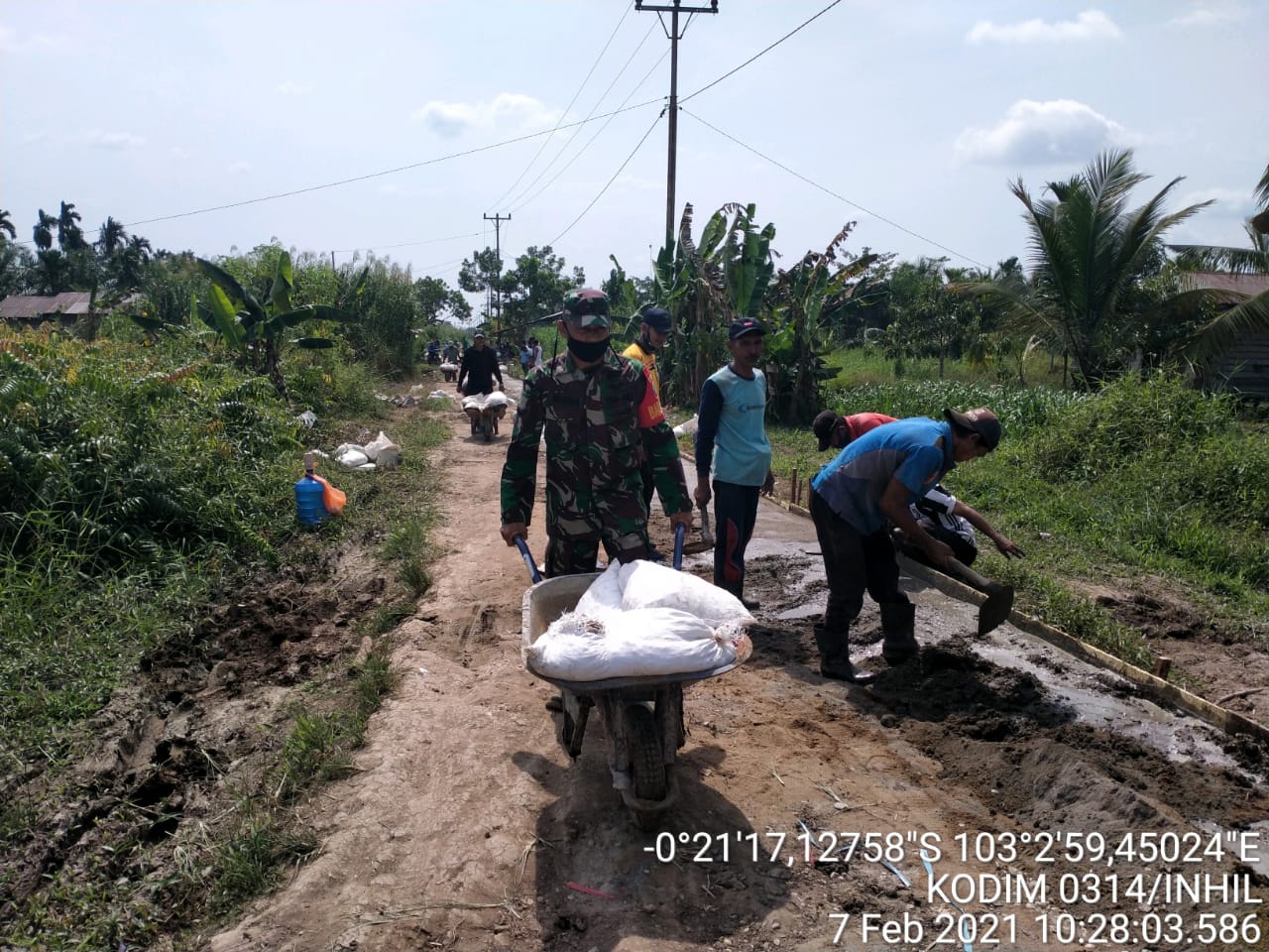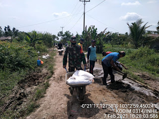 SERIBUPARITNEWS.COM, TEMBILAHANHULU - Sertu Masri Babinsa Koramil 01/Tembilahan Kodim 0314/Inhil Gotong Royong Semenisasi Jalan Aminullah parit 5 Desa Sialang panjang Kecamatan tembilahan Hulu Minggu (07/02/2021)