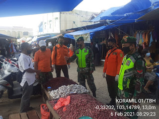 SERIBUPARITNEWS.COM,TEMBILAHANHULU - Serda Suherman Babinsa Koramil 01/Tembilahan Kodim 0314/Inhl menegakan disiplin terpadu protokol kesehatan di Pos Pasar Kayu Jati Kecamatan Tembilahan Hulu Kabupaten Indragiri Hilir Sabtu (06/02/2021)