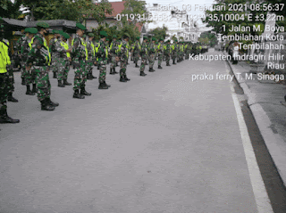 SERIBUPARITNEWS.COM, TEMBILAHAN - Personil Koramil 11/Pulau Burung Kodim 0314/Inhil Melaksanakan Prokes Gabungan TNI POLRI dan SATPOL PP di Bundaran Swarna Bumi Jalan Tembilahan Kota kabupaten Inhil Rabu (03/02/2021)