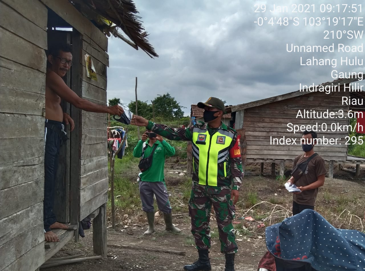SERIBUPARITNEWS.COM, GAUNG - Serda Jonlis Panggabean Babinsa Koramil 05/Gaung Anak Serka Kodim 0314/Inhil Melaksanakan Prokes Membagi bagikan Masker ke Rumah Warga di desa lahang hulu Kecamatan Gaung Jumat (29/01/2021)