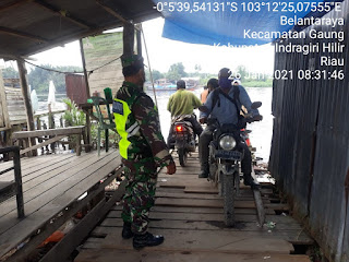 SERIBUPARITNEWS.COM, GAUNG - Babinsa Belantaraya Koramil 05/Gaung Anak Serka Kodim 0314/Inhi Serka Sasmito masih tetap Melaksanakan penegakan disiplin protokol kesehatan Kepada warga di penyeberangan antar desa Di Desa Belantak ,Kecamatan Gaung, Kab Inhil Selasa (26/01/2021)