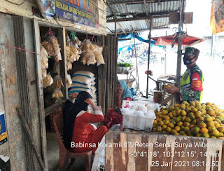 SERIBUPARITNEWS.COM,Reteh," - Dengan Pimpinan Serma Nofiandi bersama Serda Surya Wibowo Serda Ramli dan Serda Pardamean Siregar sebgai Babinsa Koramil 07/Reteh Kodim 0314/Inhil terus mengingatkan para pedagang dan pembeli di pasar tradisional untuk mematuhi protokol kesehatan guna mencegah penularan COVID-19.Senin 25/01/2021