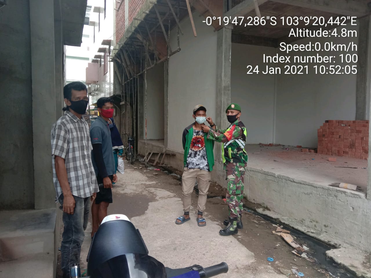 SERIBUPARITNEWS.COM, GAUNG ANAK SERKA -   Kopda Umar Nasution Babinsa Koramil 05/Gas Kodim 0314/Inhi telah melaksanakan Penegakan Disiplin Protokoler Kesehatan New Normal Penanganan Covid 19 Terpadu* di pasar Sungai Empat Kecamatan Gaung Anak Serka Minggu  (24/01/2021)