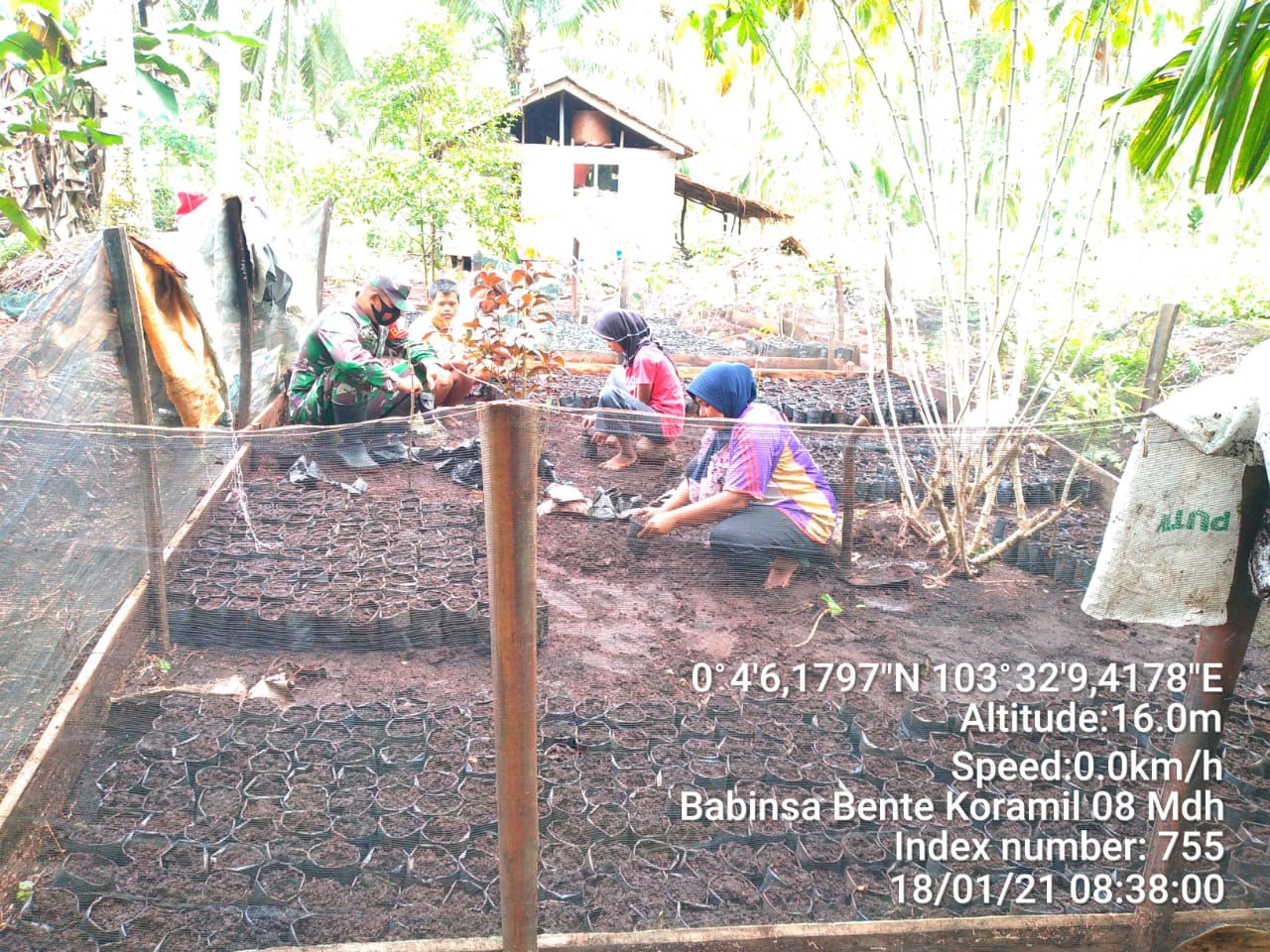 SERIBUPARITNEWS.COM, MANDAH - Babinsa Koramil 08/Mandah Kodim 0314/Inhil Praka Hendri Melaksanakan Komsos bersama Bapak Mahmud Arsidi Warga Dusun Berayun petani bibit Pinang di Desa Bente Kecamatan Mandah Kabupaten Indragiri Hirli Senin (18/01/2021)