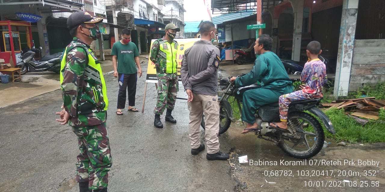 SERIBUPARITNEWS.COM,RETEH"-Babinsa Anggota Koramil 07/Reteh Jajaran Kodom 0314/Inhil, melakukan kegiatan himbauan protokol kesehatan kepada warga di jalan umum Kel P Kijang Kec Reteh Kab Inhil . (10/01/2021).