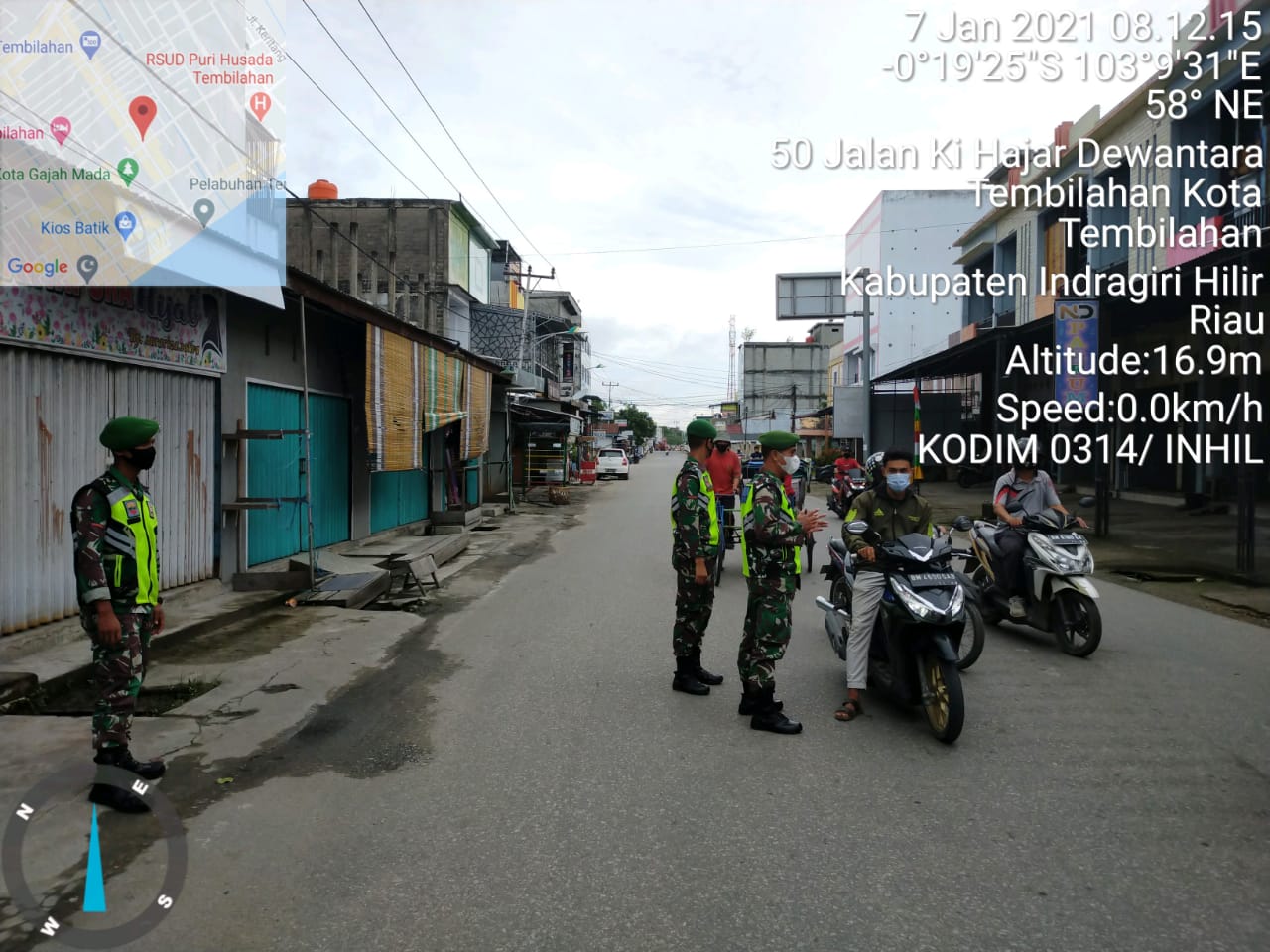 SERIBUPARITNEWS.COM, TEMBILAHAN - Sertu Zulfahri Babinsa Koramil 01/Tembilahan Kodim 0314/Inhil dalam Patroli Mobile Penegakkan Disiplin di Beberapa ruas titik di Wialyah Tembilahan dan Sekitarnya Kamis (07/01/2021)
