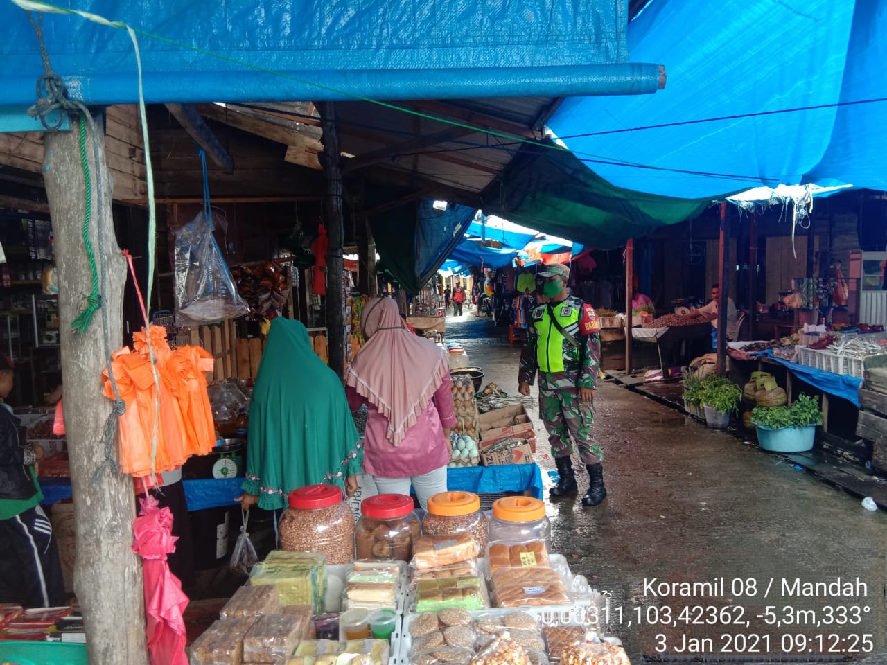 SERIBUPARITNEWS.COM,MANDAH - Babinsa Serda Erik Arianto Sibarani melaksanakan Gakplin Prokes Covid -19 kepada pengunjung di Pasar Tradisional Sendawa Desa Bakau Aceh Kecamatan  Mandah Kab. Inhil Minggu (03/01/2021)
